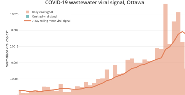 وفي هذا الصدد تُظهر البيانات من مشروع المراقبة البيئية في أوتاوا COVID-19 أن الإشارة الفيروسية المتدحرجة لمدة سبعة أيام قد انخفضت قليلاً ، على الرغم من أنها لا تزال عند مستوى قياسي قريب